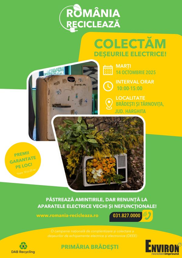 România Reciclează, campania națională de colectare a deșeurilor electrice și bateriilor uzate, ajunge marți, 14 octombrie 2025, în Brădești și Târnovița, județul Harghita!