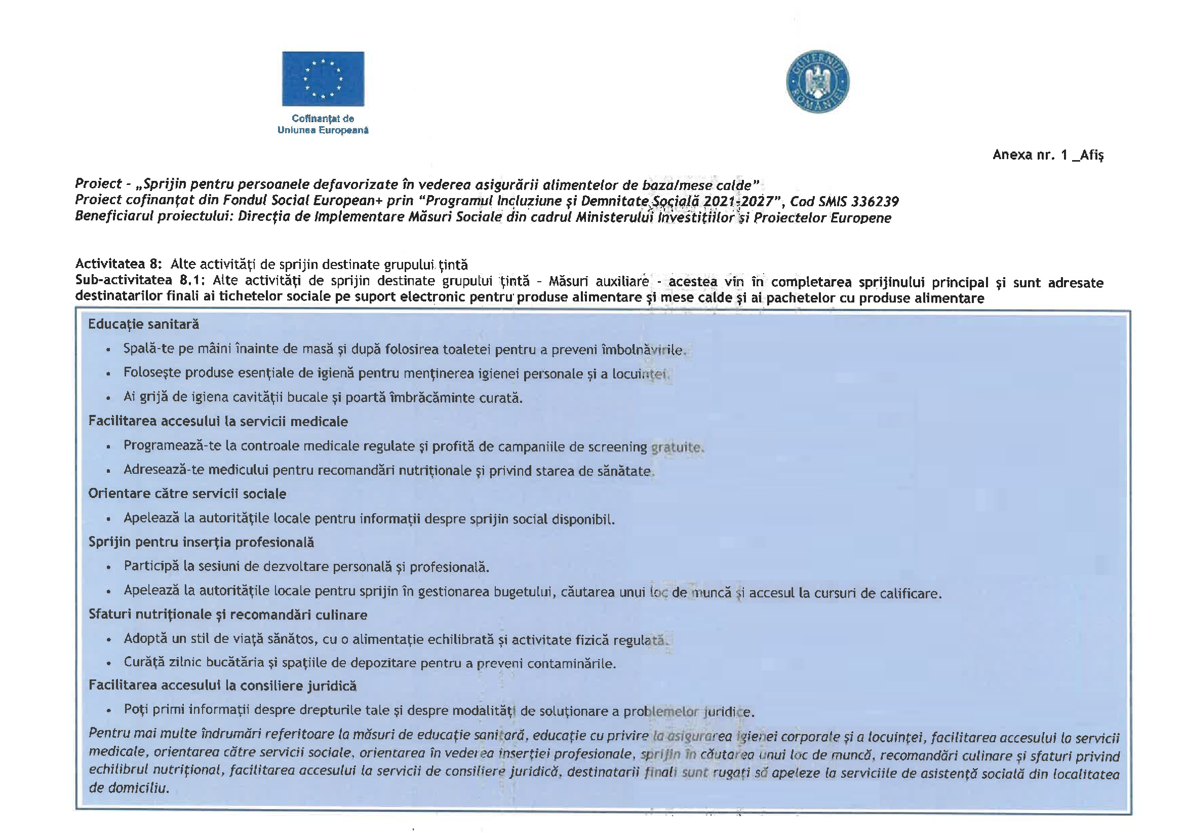 Pentru mai multe îndrumări referitoare la măsuri de educație sanitară, educație cu privire la asigurarea igienei corporale și a locuinței, facilitarea accesului la servicii medicale, orientarea către servicii sociale, orientarea în vederea inserției profesionale, sprijin în căutarea unui loc de muncă, recomandări culinare, sfaturi privind echilibru nutrițional, facilitarea accesului la servicii de consiliere juridică – destinatarii finali sunt rugați să apeleze la serviciile de asistență socială din localitatea de domiciliu.